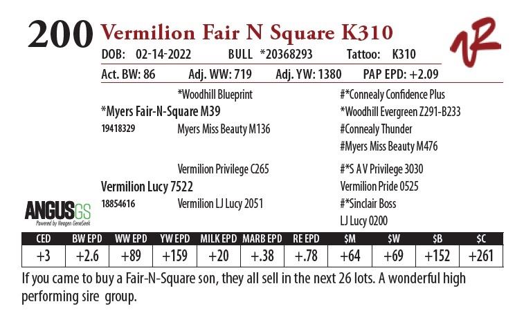 All bulls will be covered 50% by Vermilion Ranch if they are injured during their first breeding season. Breeding season is defined as the 60-day period following the first turnout of bulls.