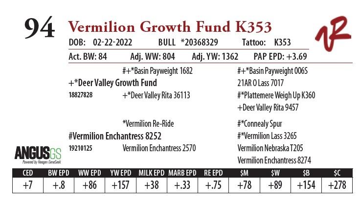 All bulls will be covered 50% by Vermilion Ranch if they are injured during their first breeding season. Breeding season is defined as the 60-day period following the first turnout of bulls.