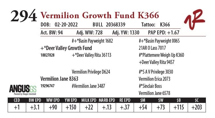 All bulls will be covered 50% by Vermilion Ranch if they are injured during their first breeding season. Breeding season is defined as the 60-day period following the first turnout of bulls.
