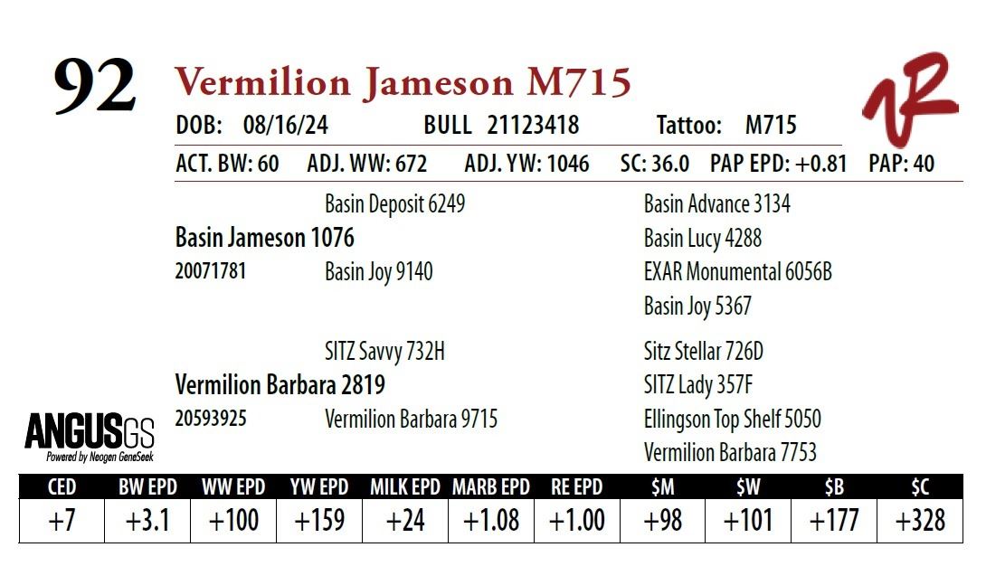 All bulls will be covered 50% by Vermilion Ranch if they are injured during their first breeding season. Breeding season is defined as the 60-day period following the first turnout of bulls.
