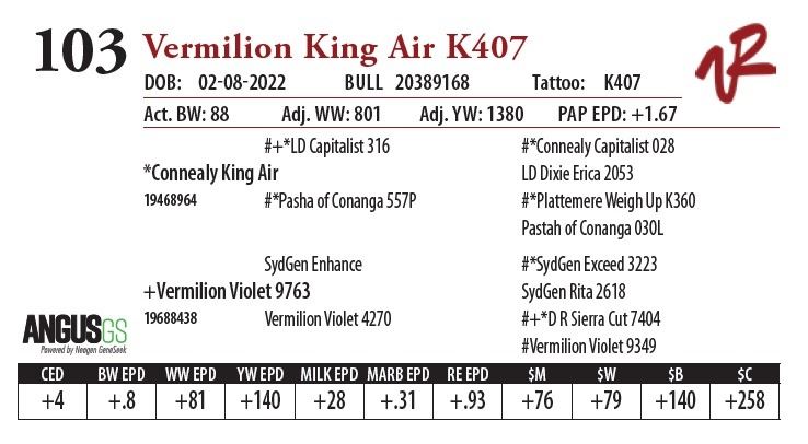 All bulls will be covered 50% by Vermilion Ranch if they are injured during their first breeding season. Breeding season is defined as the 60-day period following the first turnout of bulls.