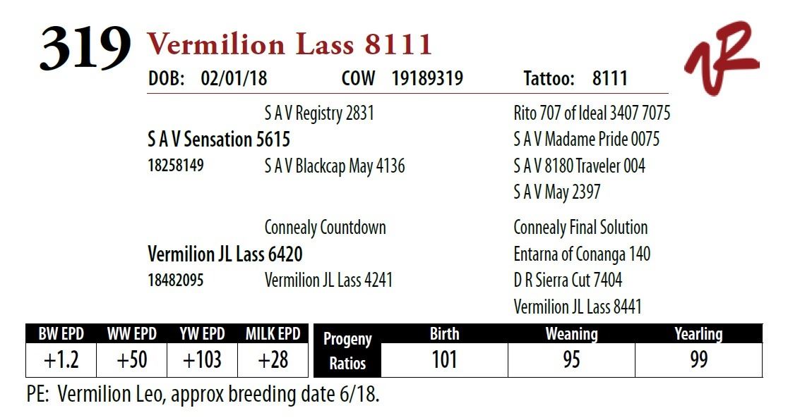 All bulls will be covered 50% by Vermilion Ranch if they are injured during their first breeding season. Breeding season is defined as the 60-day period following the first turnout of bulls.