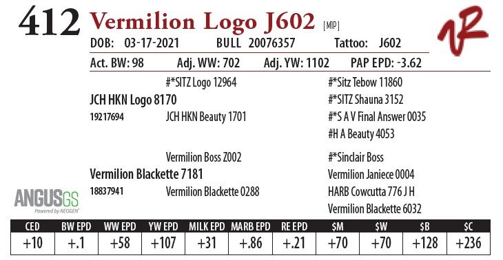 All bulls will be covered 50% by Vermilion Ranch if they are injured during their first breeding season. Breeding season is defined as the 60-day period following the first turnout of bulls.