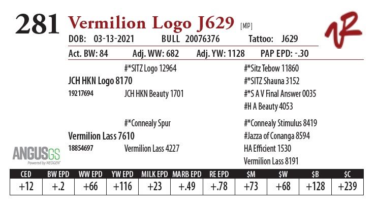 All bulls will be covered 50% by Vermilion Ranch if they are injured during their first breeding season. Breeding season is defined as the 60-day period following the first turnout of bulls.