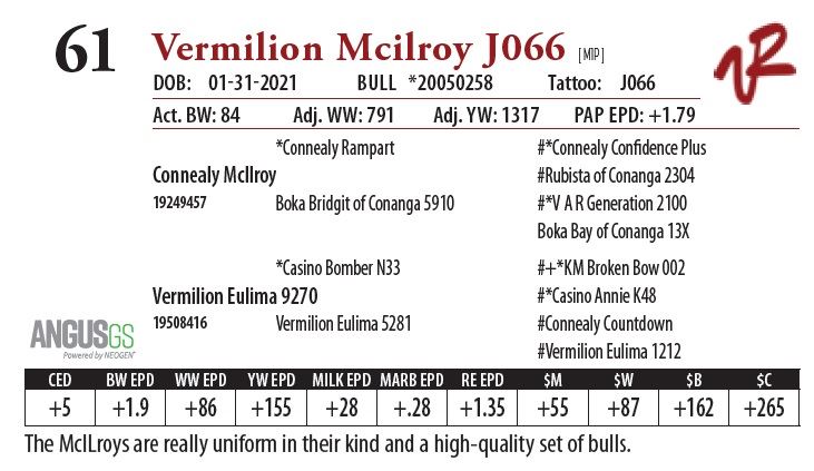 All bulls will be covered 50% by Vermilion Ranch if they are injured during their first breeding season. Breeding season is defined as the 60-day period following the first turnout of bulls.