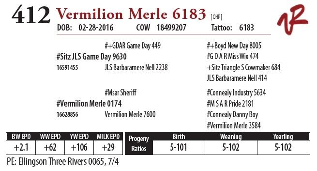All bulls will be covered 50% by Vermilion Ranch if they are injured during their first breeding season. Breeding season is defined as the 60-day period following the first turnout of bulls.
