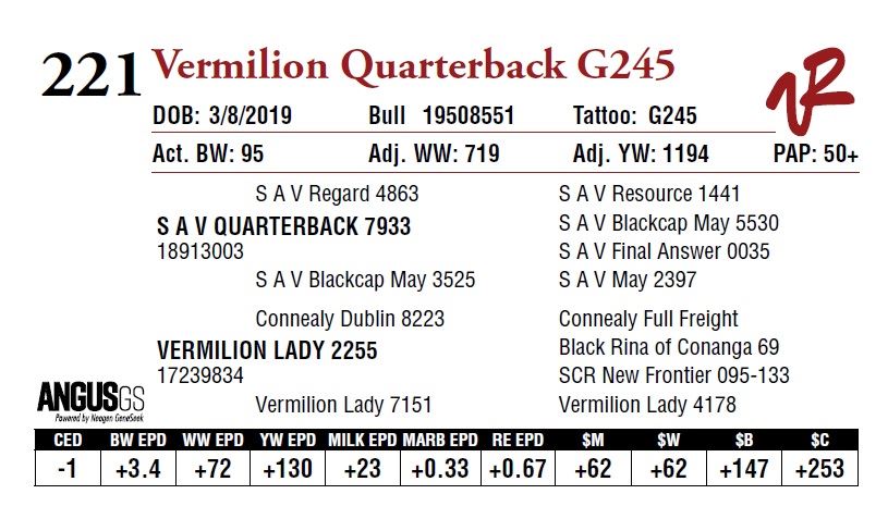 All bulls will be covered 50% by Vermilion Ranch if they are injured during their first breeding season. Breeding season is defined as the 60-day period following the first turnout of bulls.