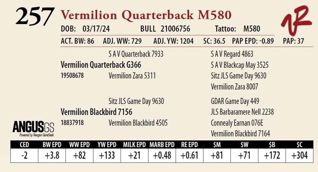 All bulls will be covered 50% by Vermilion Ranch if they are injured during their first breeding season. Breeding season is defined as the 60-day period following the first turnout of bulls.