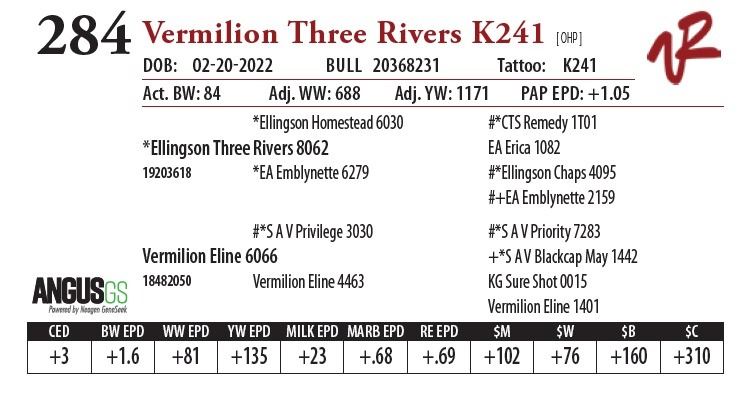 All bulls will be covered 50% by Vermilion Ranch if they are injured during their first breeding season. Breeding season is defined as the 60-day period following the first turnout of bulls.