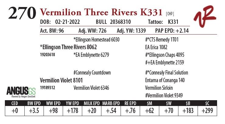 All bulls will be covered 50% by Vermilion Ranch if they are injured during their first breeding season. Breeding season is defined as the 60-day period following the first turnout of bulls.
