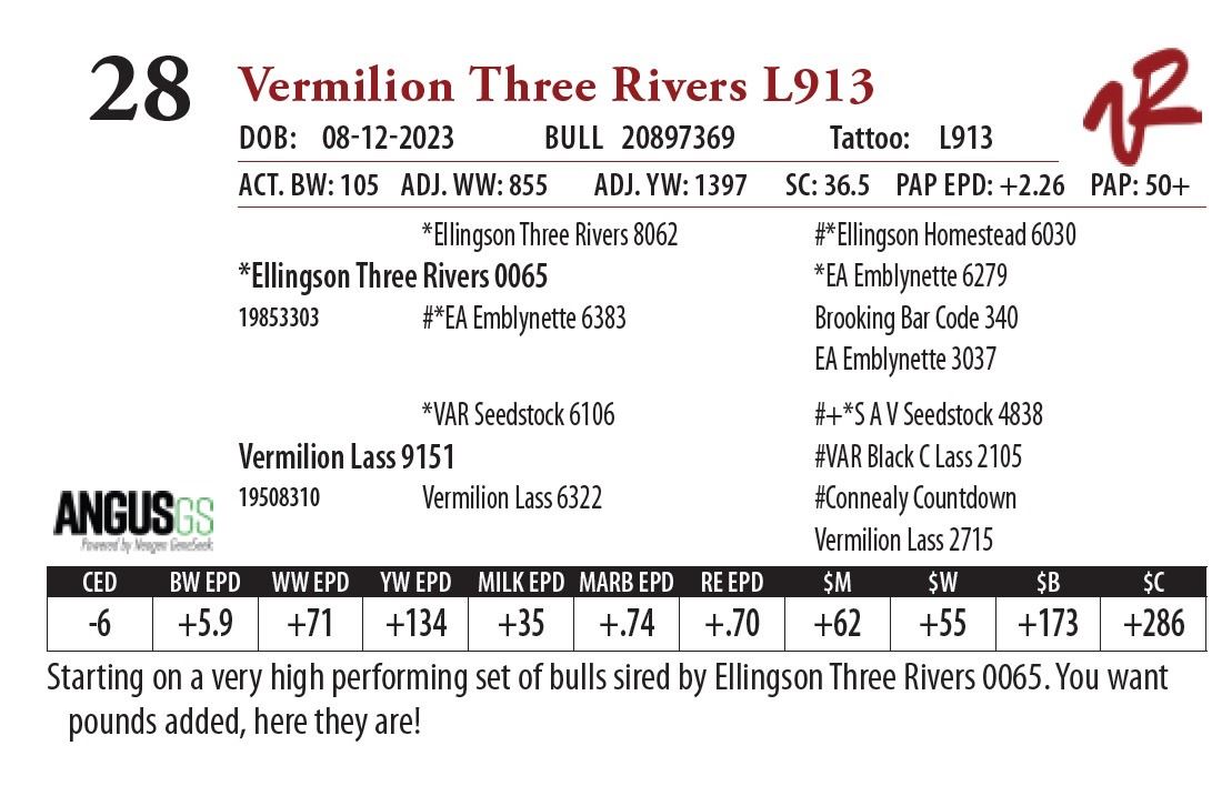 All bulls will be covered 50% by Vermilion Ranch if they are injured during their first breeding season. Breeding season is defined as the 60-day period following the first turnout of bulls.