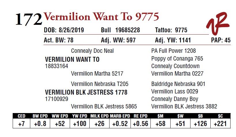 All bulls will be covered 50% by Vermilion Ranch if they are injured during their first breeding season. Breeding season is defined as the 60-day period following the first turnout of bulls.