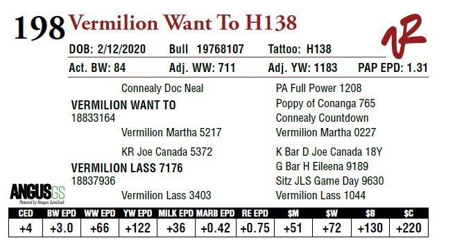 All bulls will be covered 50% by Vermilion Ranch if they are injured during their first breeding season. Breeding season is defined as the 60-day period following the first turnout of bulls.