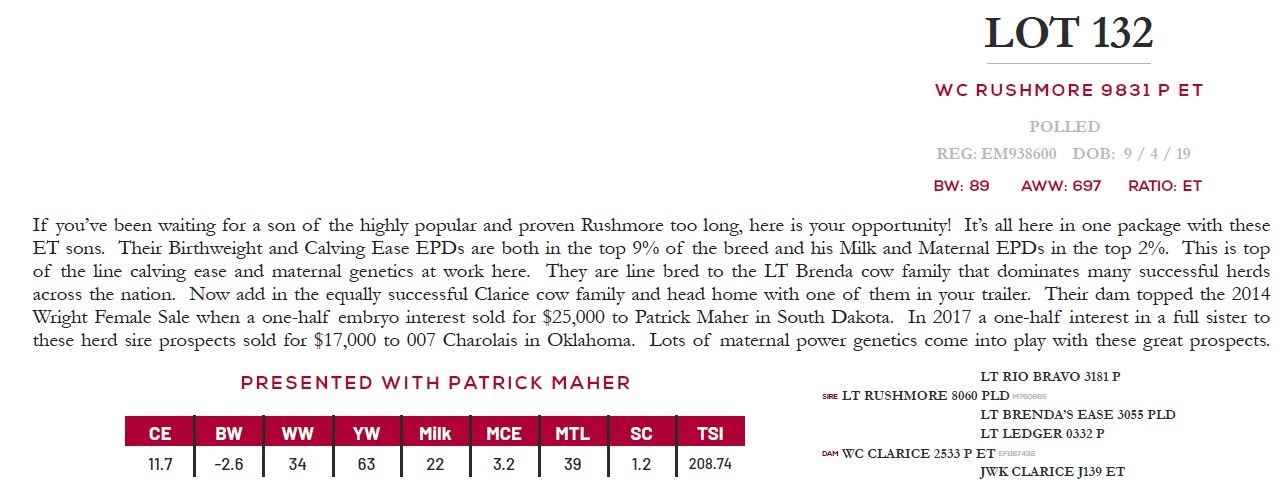 Wright Female Sale when a one-half embryo interest sold for $25,000 to Patrick Maher in South Dakota. In 2017 a one-half interest in a full sister to