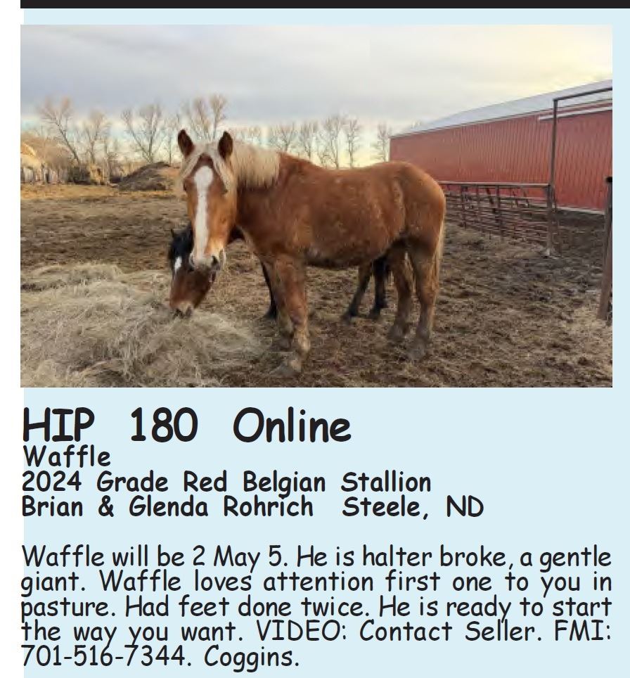 Waffle - 2024 Grade Red Belgian Stallion - Brian & Glenda Rohrich, Steele, ND - Waffle will be 2 May 5. He is halter broke, a gentle giant. Waffle loves attention first one to you in pasture. Had feet done twice. He is ready to start the way you want. VIDEO: Contact Seller. FMI: 701-516-7344. Coggins.