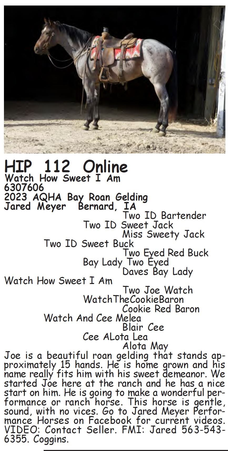 Watch How Sweet I Am - 6307606 - 2023 AQHA Bay Roan Gelding - Jared Meyer, Bernard, IA - Joe is a beautiful roan gelding that stands approximately 15 hands. He is home grown and his name really fits him with his sweet demeanor. We started Joe here at the ranch and he has a nice start on him. He is going to make a wonderful performance or ranch horse. This horse is gentle, sound, with no vices. Go to Jared Meyer Performance Horses on Facebook for current videos. VIDEO: Contact Seller. FMI: Jared 563-543-6355. Coggins.