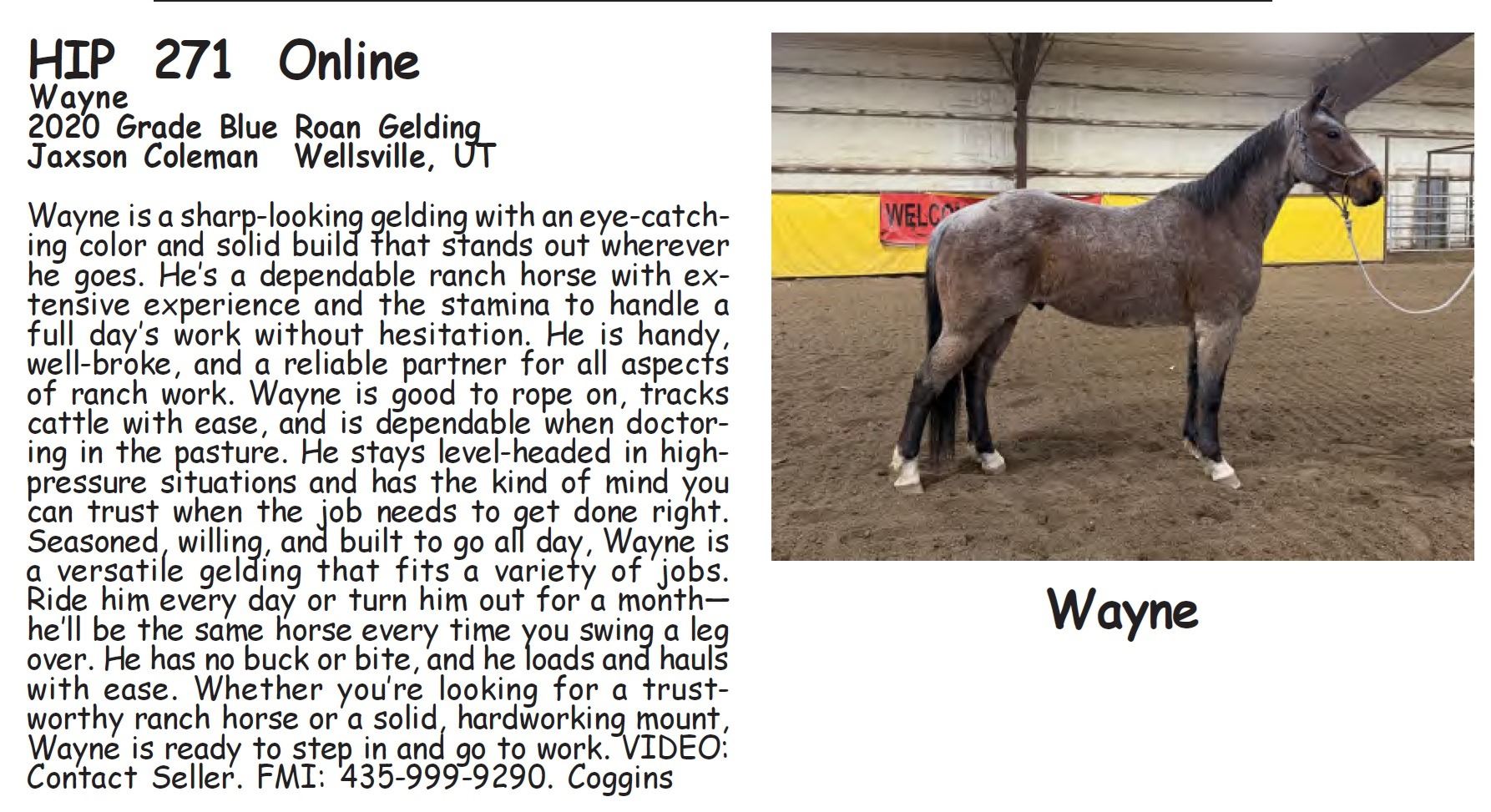 Wayne - 2020 Grade Blue Roan Gelding - Jaxson Coleman, Wellsville, UT - Wayne is a sharp-looking gelding with an eye-catching color and solid build that stands out wherever he goes. He’s a dependable ranch horse with extensive experience and the stamina to handle a full day’s work without hesitation. He is handy, well-broke, and a reliable partner for all aspects of ranch work. Wayne is good to rope on, tracks cattle with ease, and is dependable when doctoring in the pasture. He stays level-headed in high-pressure situations and has the kind of mind you can trust when the job needs to get done right. Seasoned, willing, and built to go all day, Wayne is a versatile gelding that fits a variety of jobs. Ride him every day or turn him out for a month—he’ll be the same horse every time you swing a leg over. He has no buck or bite, and he loads and hauls with ease. Whether you’re looking for a trustworthy ranch horse or a solid, hardworking mount, Wayne is ready to step in and go to work. VIDEO: Contact Seller. FMI: 435-999-9290. Coggins
