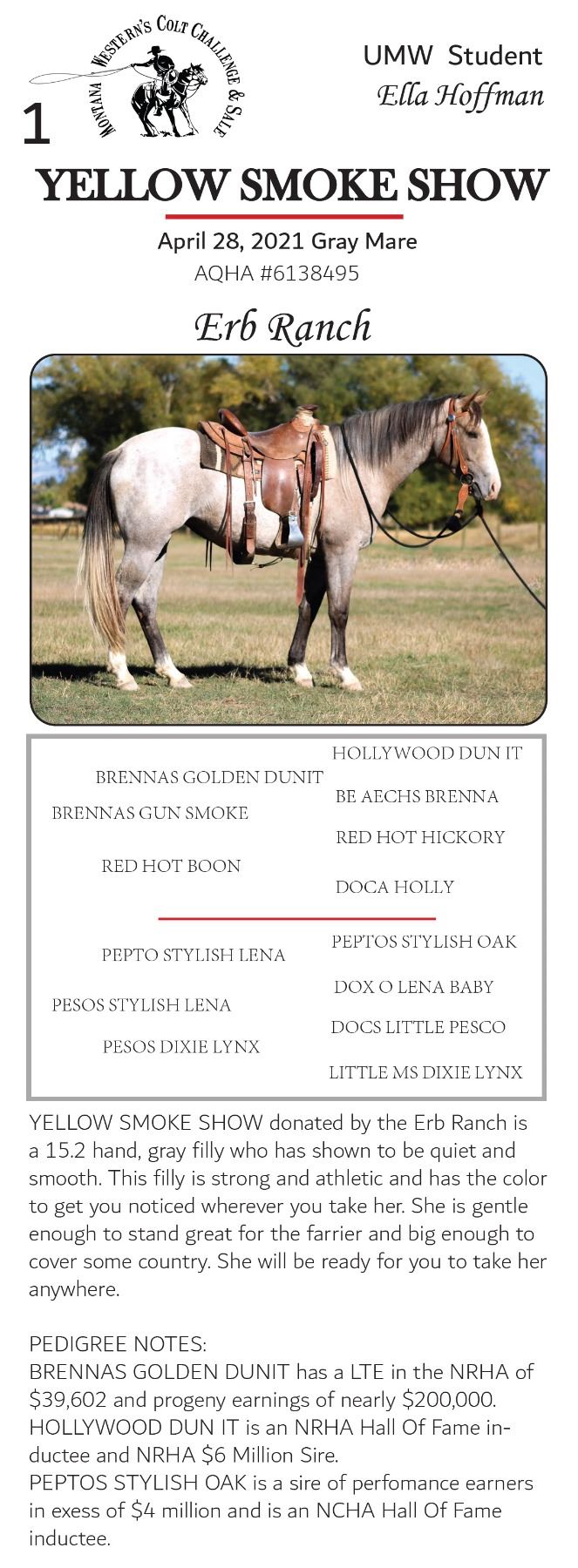 Yellow Smoke Show donated by the Erb Ranch is a 15.2 hand, gray filly who has shown to be quiet and smooth. This filly is strong and athletic and has the color to get you noticed wherever you take her. She is gentle enough to stand great for the farrier and big enough to cover some country. She will be ready for you to take her anywhere.