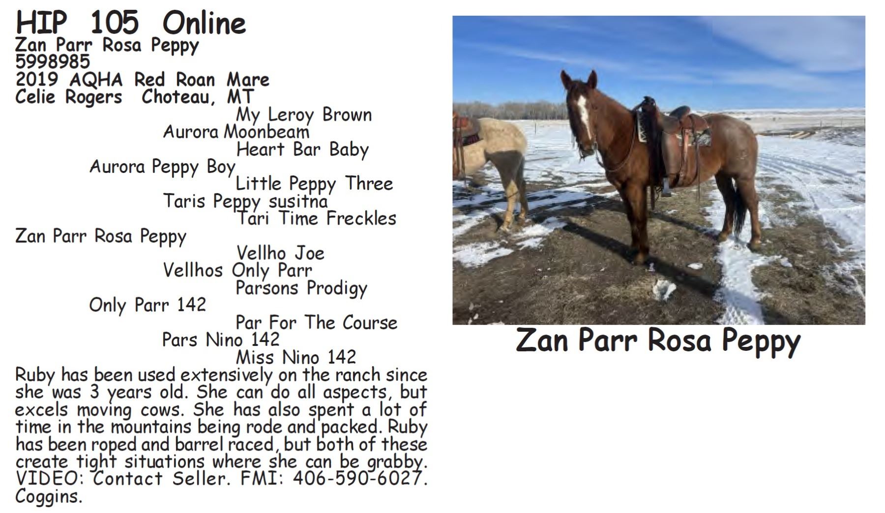 Zan Parr Rosa Peppy - 5998985 - 2019 AQHA Red Roan Mare - Celie Rogers, Choteau, MT - Ruby has been used extensively on the ranch since she was 3 years old. She can do all aspects, but excels moving cows. She has also spent a lot of time in the mountains being rode and packed. Ruby has been roped and barrel raced, but both of these create tight situations where she can be grabby. VIDEO: Contact Seller. FMI: 406-590-6027. Coggins.