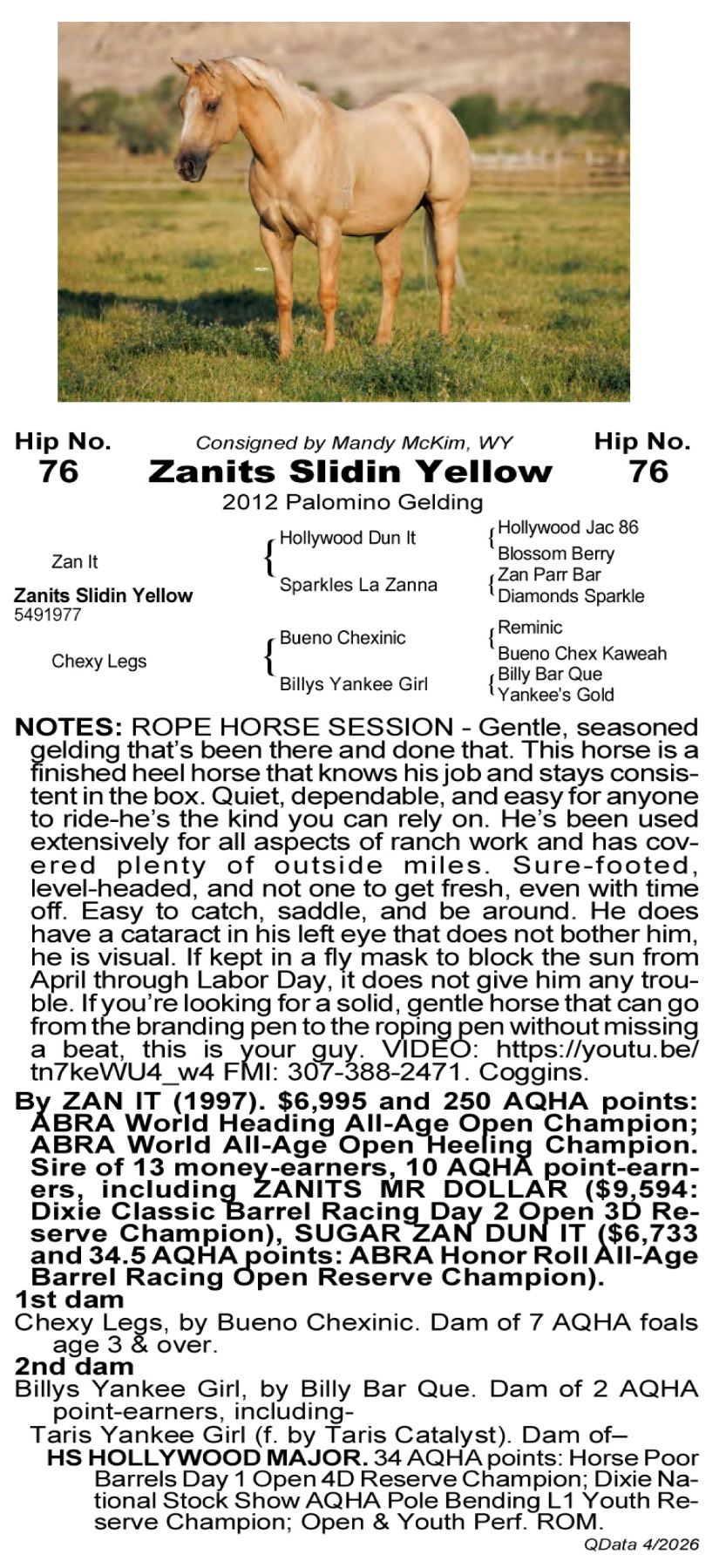 Zanits Slidin Yellow -5491977 - 2012 AQHA Palomino Gelding - Mandy McKim, Basin, WY - Gentle, seasoned gelding that’s been there and done that. This horse is a finished heel horse that knows his job and stays consistent in the box. Quiet, dependable, and easy for anyone to ride—he’s the kind you can rely on whether you’re in the arena or out on the ranch. He’s been used extensively for all aspects of ranch work and has covered plenty of outside miles. Sure-footed, level-headed, and not one to get fresh, even with time off. Easy to catch, saddle, and be around—just a good, honest gelding. He does have a cataract in his left eye that does not bother him—he is visual. If kept in a fly mask to block the sun from April through Labor Day, it does not give him any trouble. If you’re looking for a solid, gentle horse that can go from the branding pen to the roping pen without missing a beat, this is your guy. VIDEO: https://youtu.be/tn7keWU4_w4 FMI: 307-388-2471. Coggins.
