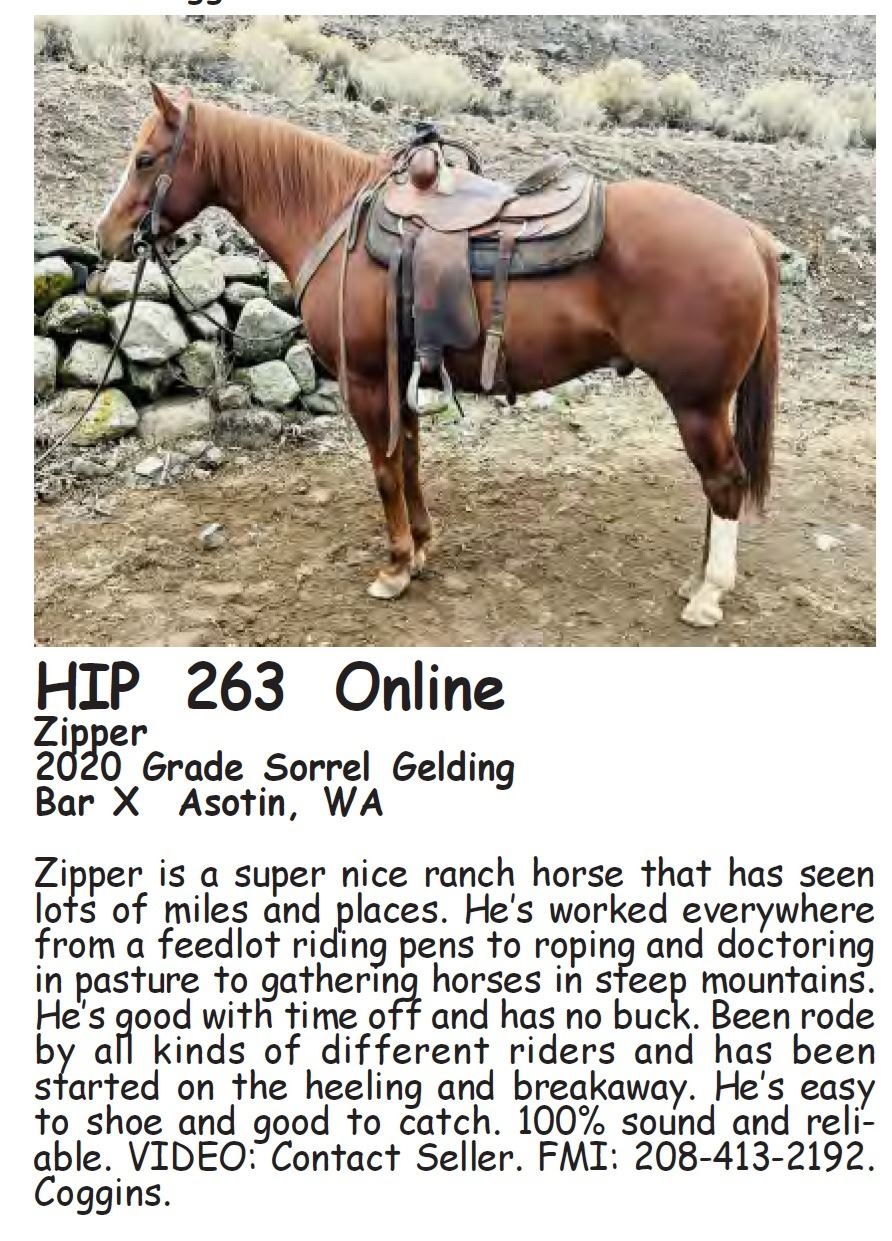 Zipper - 2020 Grade Sorrel Gelding - Bar X, Asotin, WA - Zipper is a super nice ranch horse that has seen lots of miles and places. He’s worked everywhere from a feedlot riding pens to roping and doctoring in pasture to gathering horses in steep mountains. He’s good with time off and has no buck. Been rode by all kinds of different riders and has been started on the heeling and breakaway. He’s easy to shoe and good to catch. 100% sound and reliable. VIDEO: Contact Seller. FMI: 208-413-2192. Coggins.